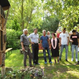 Bei einem Rundgang informierten sich die Besucher über das 1. Modul des Projekts, welches großen Beifall fand. Sei es z.B. der neu entstandene Eingang mit Hinweistafeln und Flyer, die Steinbank, auf der Hoffmann von Fallersleben – dem Dichter des Kinderliedes „Summ, summ, summ … ; die liebevoll gestalteten Info-Tafeln zu den einzelnen Bereichen des Bienengartens, die Ausstellung von imkerlichen Gerätschaften, die überdimensionierte Insektennisthilfe für Wildbienen und andere Bestäuberinsekten und vieles mehr.